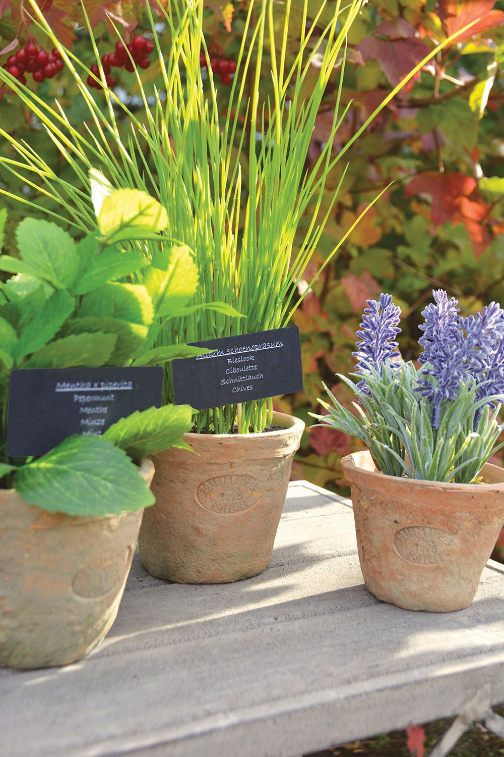Decorative plastic Chives with wooden planter with the name of the herb (in Latin, Dutch, French, German and English). Terra cotta pot with a Robert Stevens & stamp.Chives in AT pot L, Terra cotta, PE, polystyrene, wood