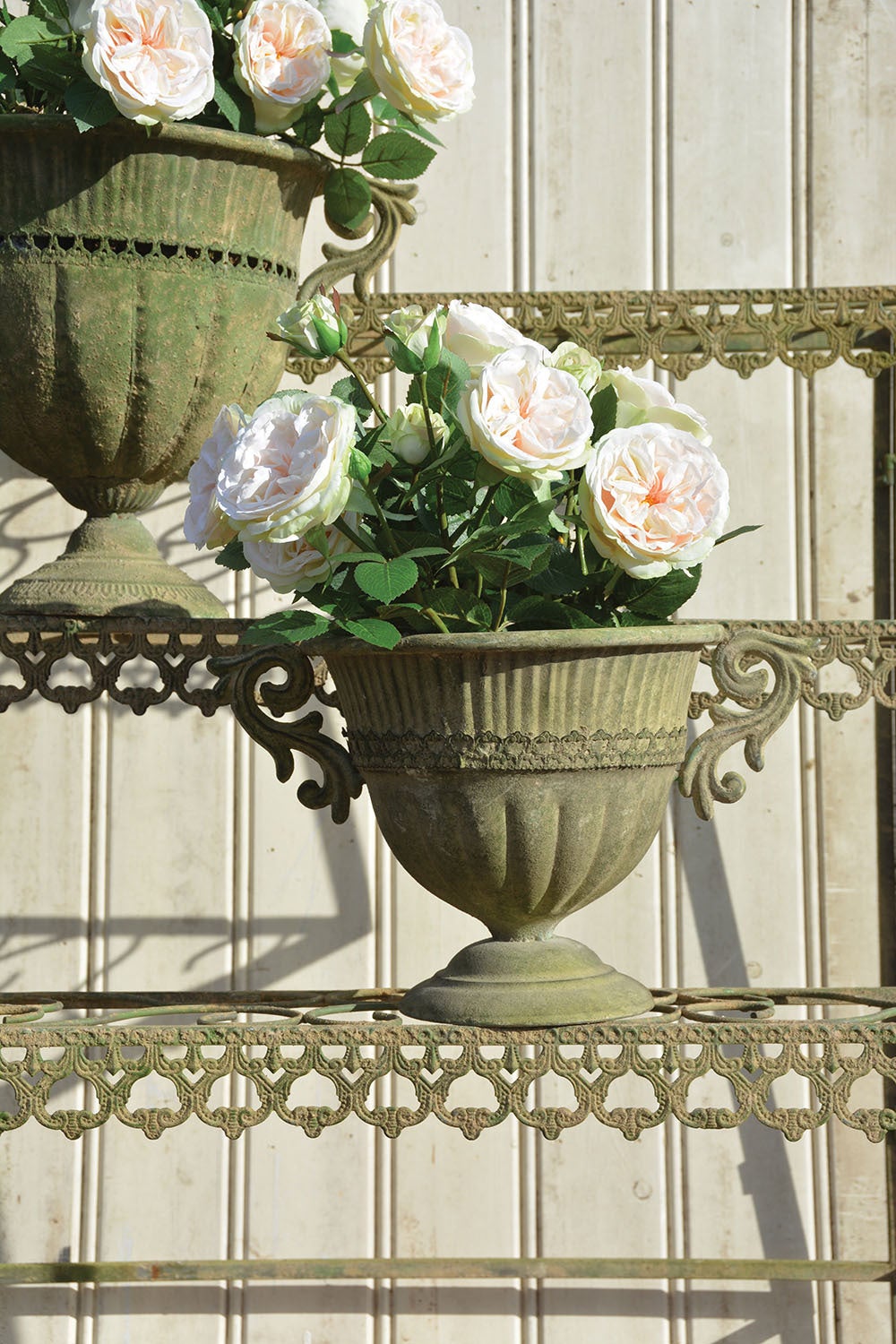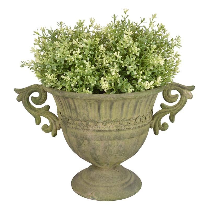 The weathered material in this decorative piece brings about a natural, serene and authentic atmosphere to the garden. This round vase does not only add a lot of atmosphere, but is a beautiful garden accessory even without plants or flowers. The handy handles make it easy to move the item.- drainage hole- handlesAged Metal Green urn round S, Mild steel