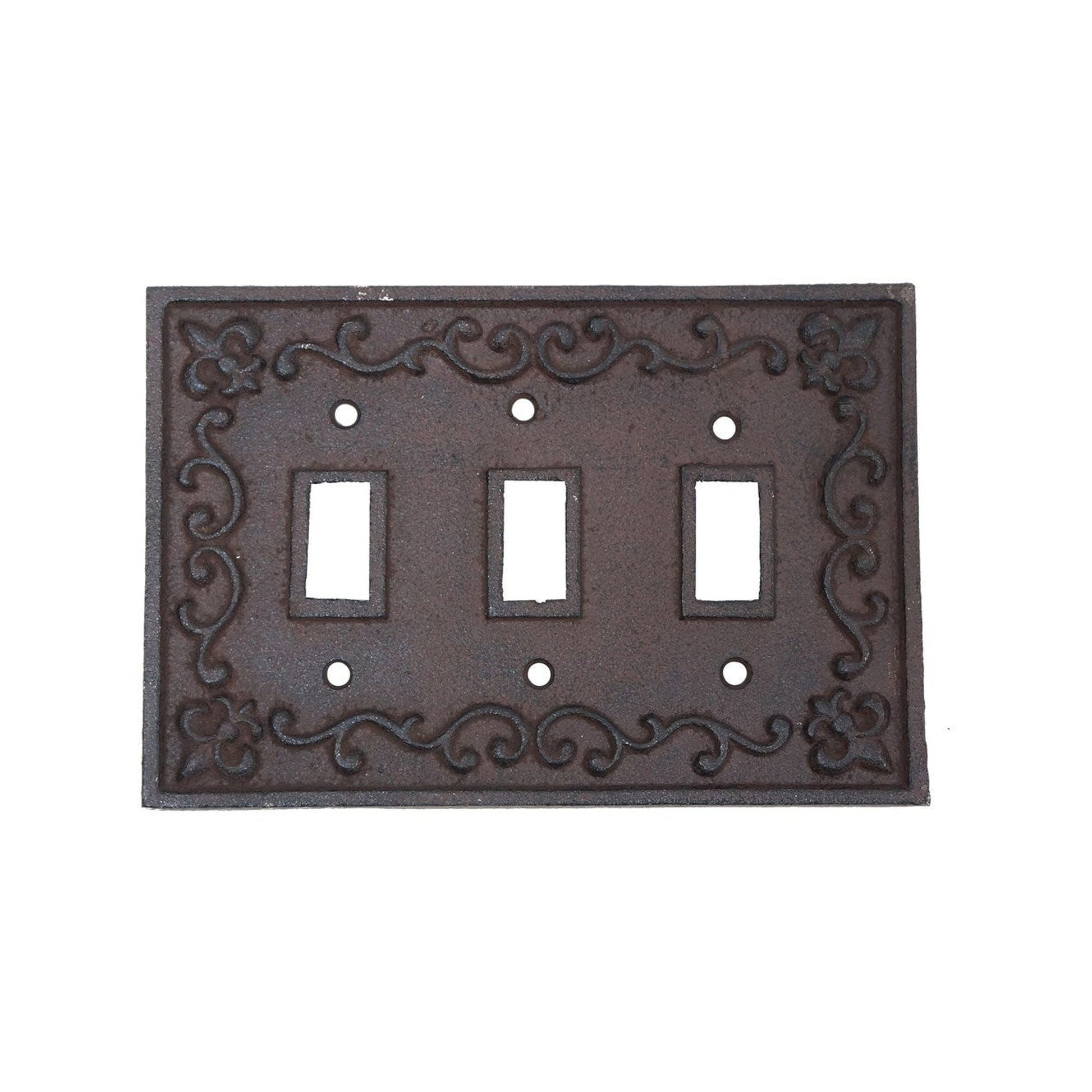 This rustic brown triple light switch cover plate by Kel Cast Iron adds a touch of classic style to your home. Measuring 7.2" x .25" x 4.9", it's designed to fit most standard switches. Its durable cast iron construction ensures lasting protection and a stylish look.