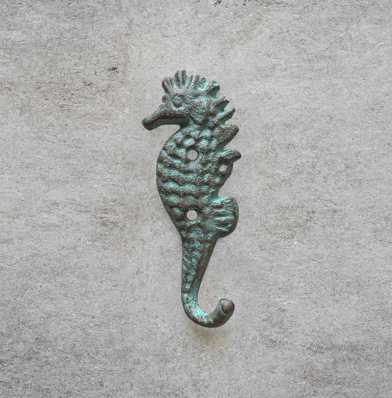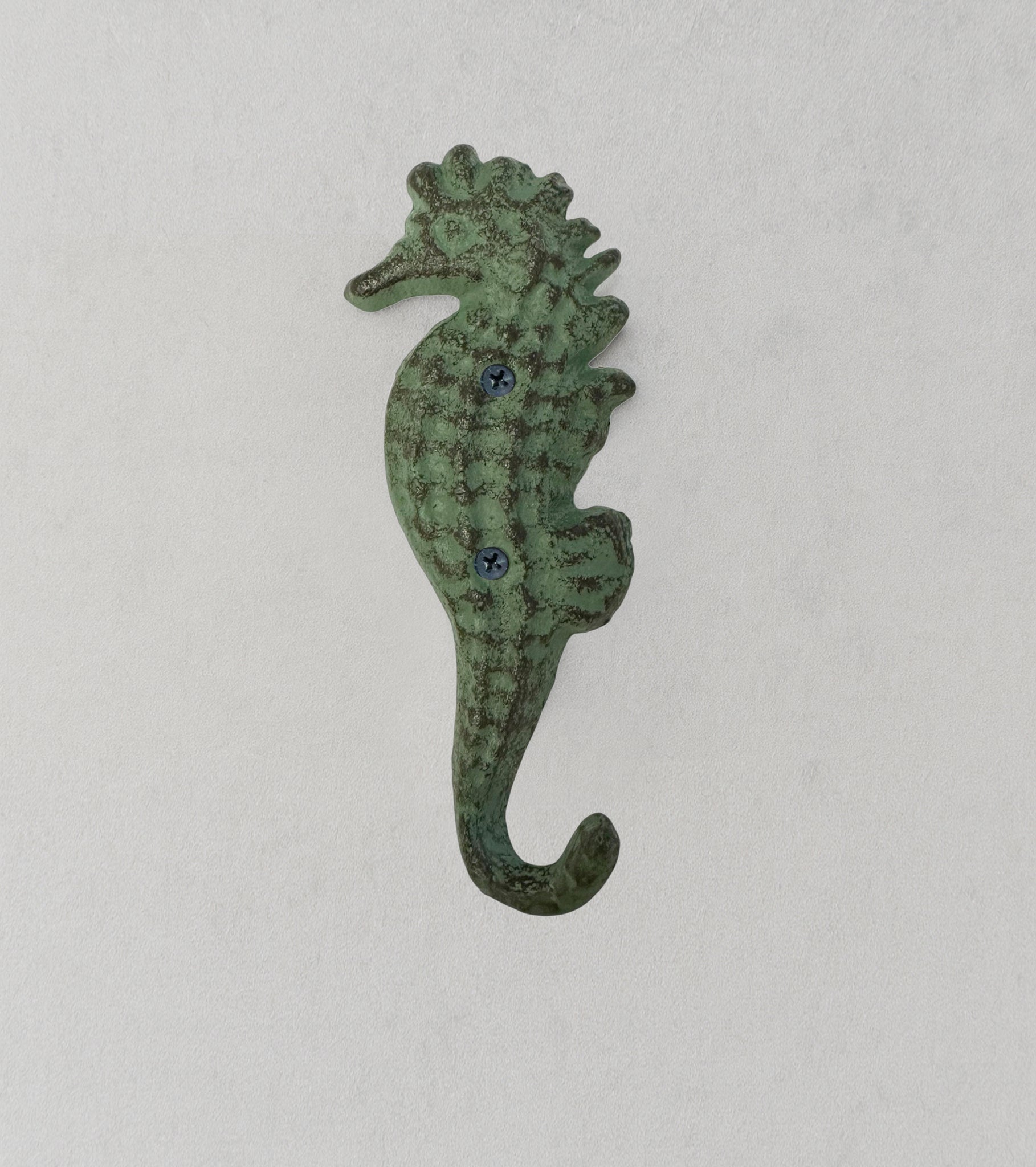 The Seahorse Hook is the perfect combination of function and style. This cast iron hook measures 2x1x5.2 inches and features a beautiful seahorse design with a green & copper finish. Enjoy the combination of strength and beauty with this nautical wall hook.