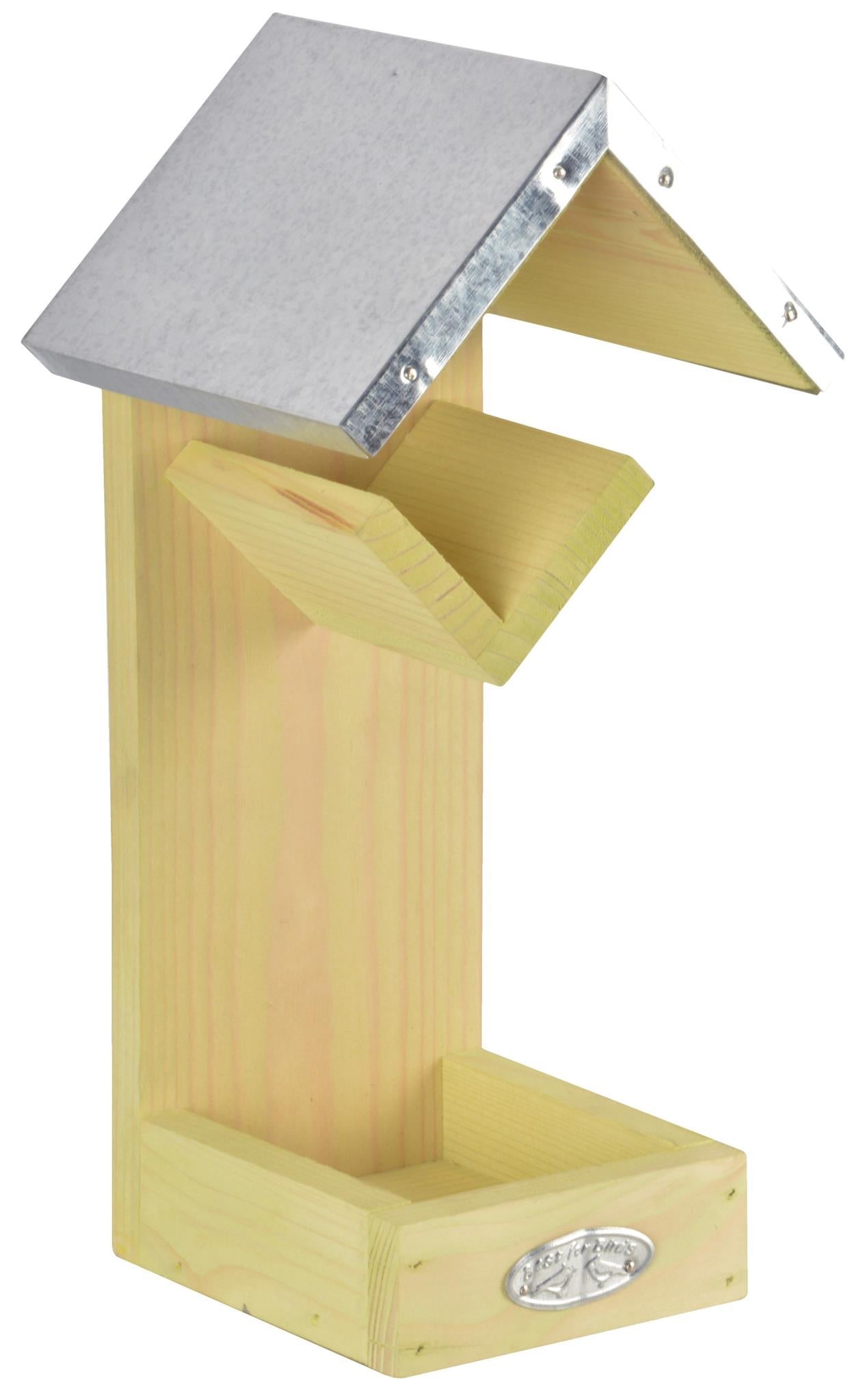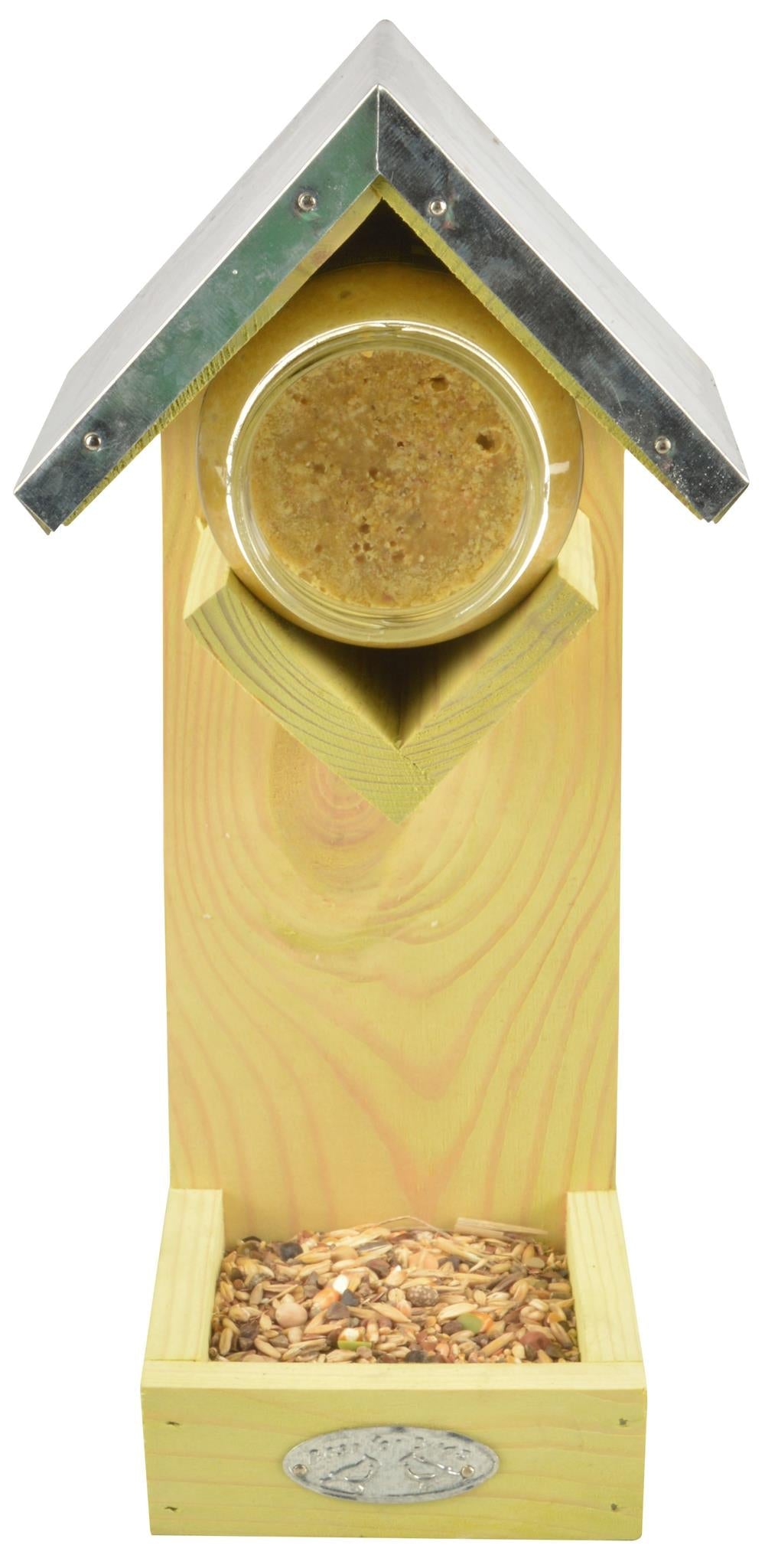 No garden can go without a bird feeding house. This basic feeding house which is made from natural materials offers birds two feeding options. In the top part you can place a peanut butter jar, the bottom tray you can fill with different types of feed. - key hole in the back.Peanut butter house w/feeder, LC, *This item does not contain bird food.*
