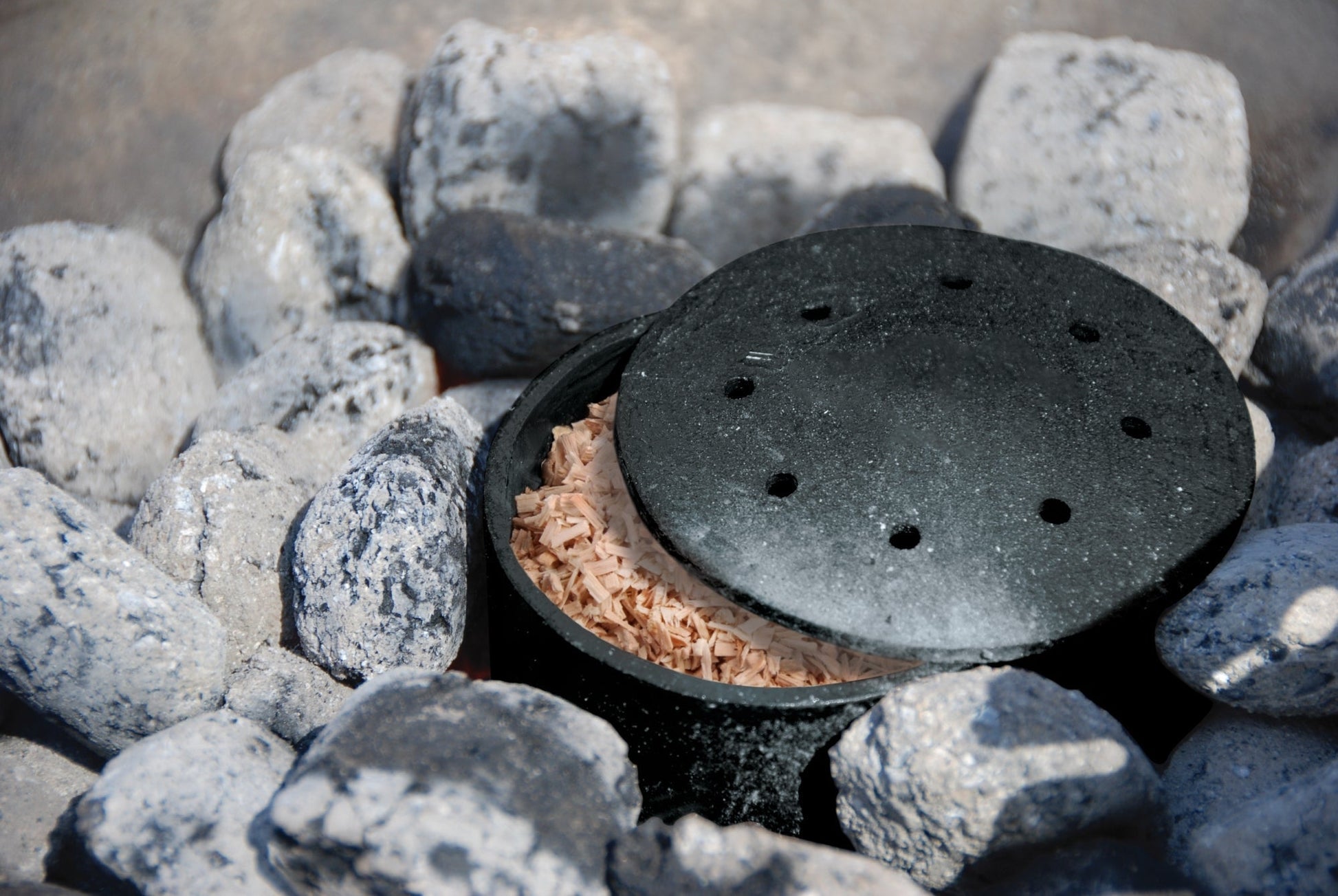 With this smoke box filled with a selection of woodchips, it is easy to give food a unique flavour. The smoker has to be placed between the briquettes.- made from cast iron- including wood chips- easy to useSmoke Box, 4x4x2.8; 6x3.6x3.2 in