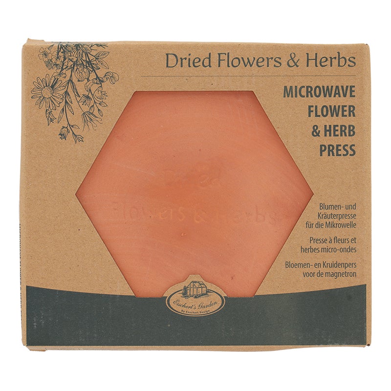 Drying flowers in the traditional way can take up to three weeks. This terracotta microwave flower press will dry flowers and herbs within minutes. An advantage of drying flowers in this way, is that the colours are preserved better.- dries flowers in two minutes- coloursof the flowers are preserved better- set includes 2 layers of terracotta, 2 layers of filt and 3 silicon loopsFlower & herb press micro wave, 7.7x6.8x1.3 in, Item Weight: 2.3 lb