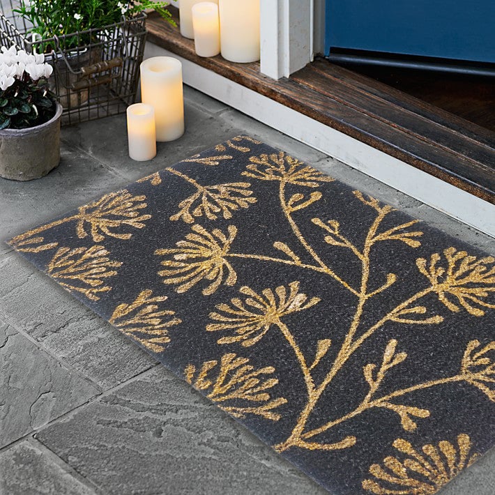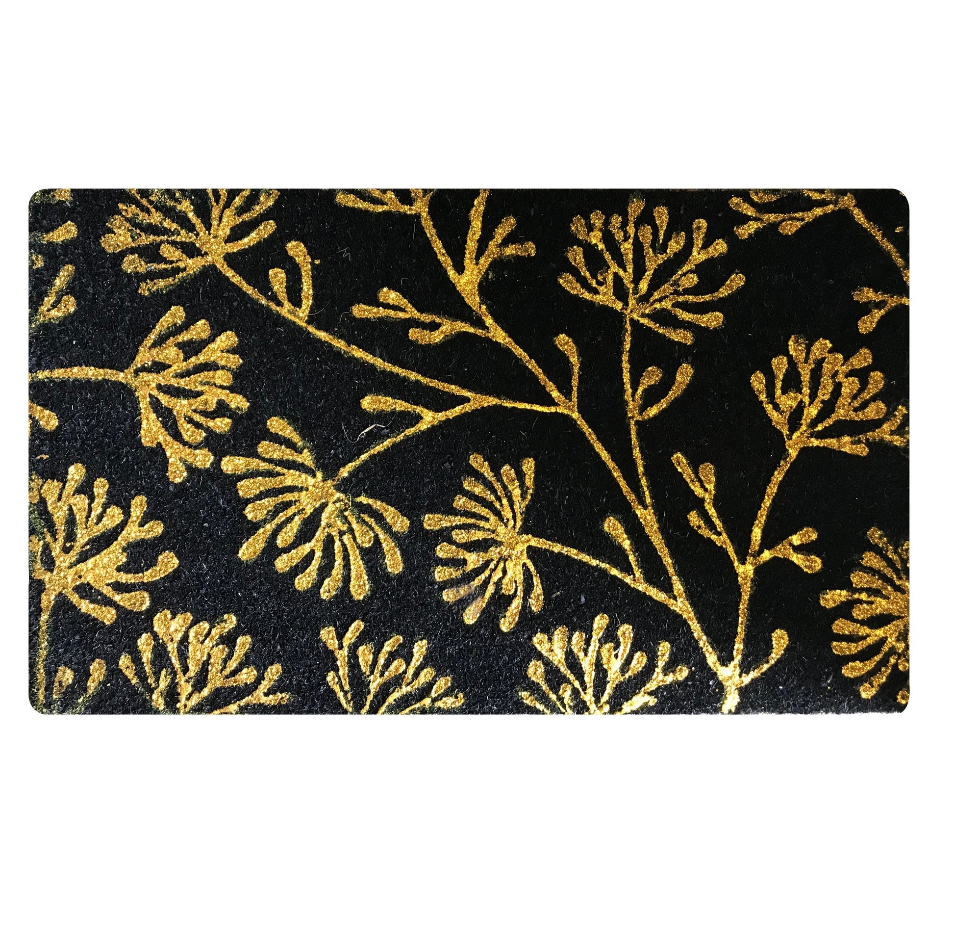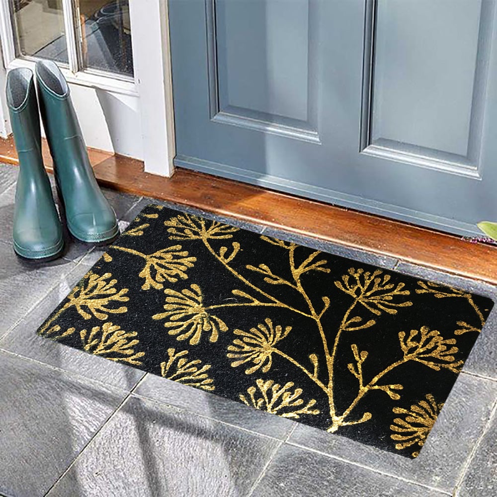 This 18x30in Floral Coir Doormat is an ideal entry rug for both indoors and outdoors. It's handmade with eco-friendly materials, while the glitter detailing adds a touch of elegance. Ideal for any entryway, this sophisticated doormat will welcome guests to your home in style.