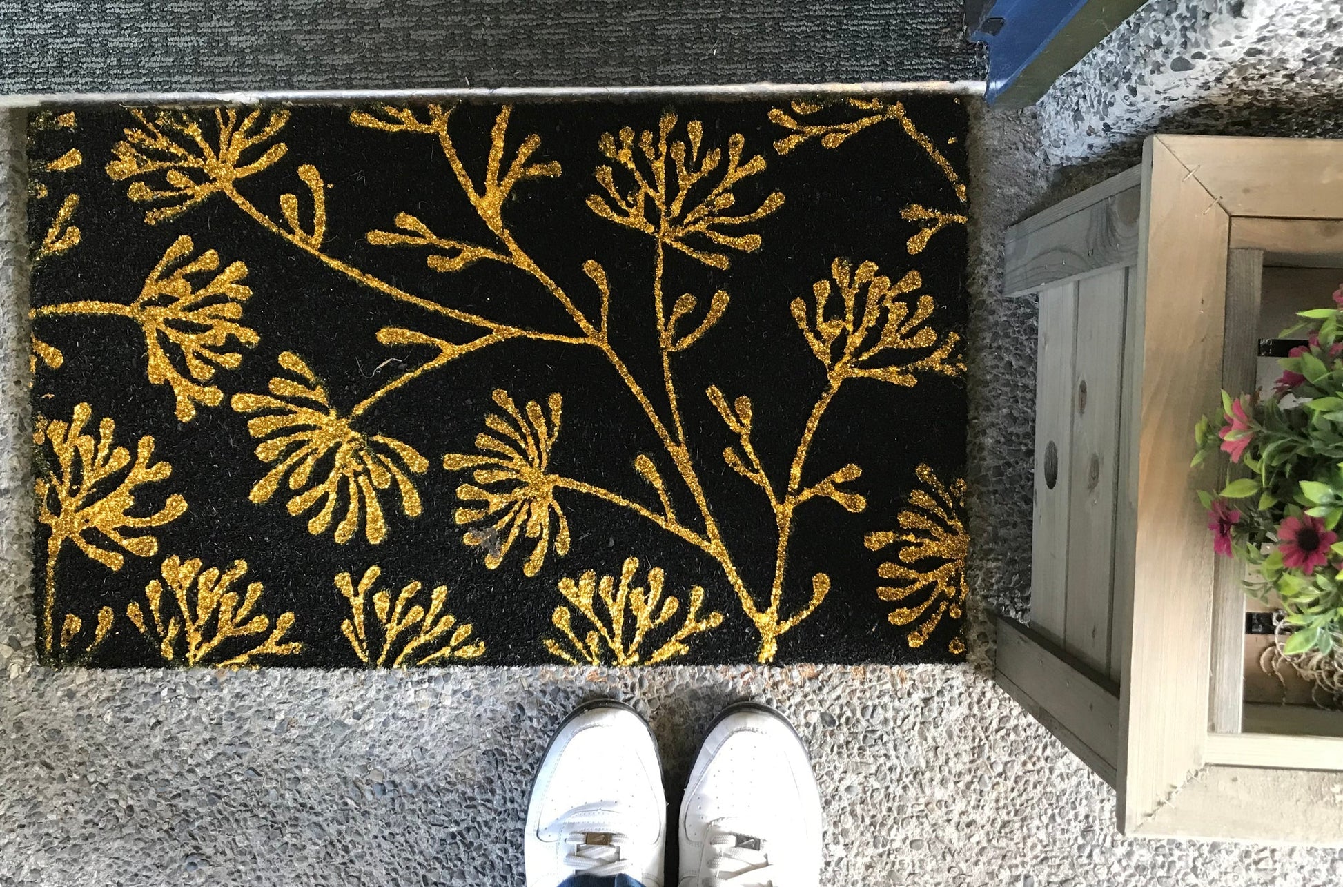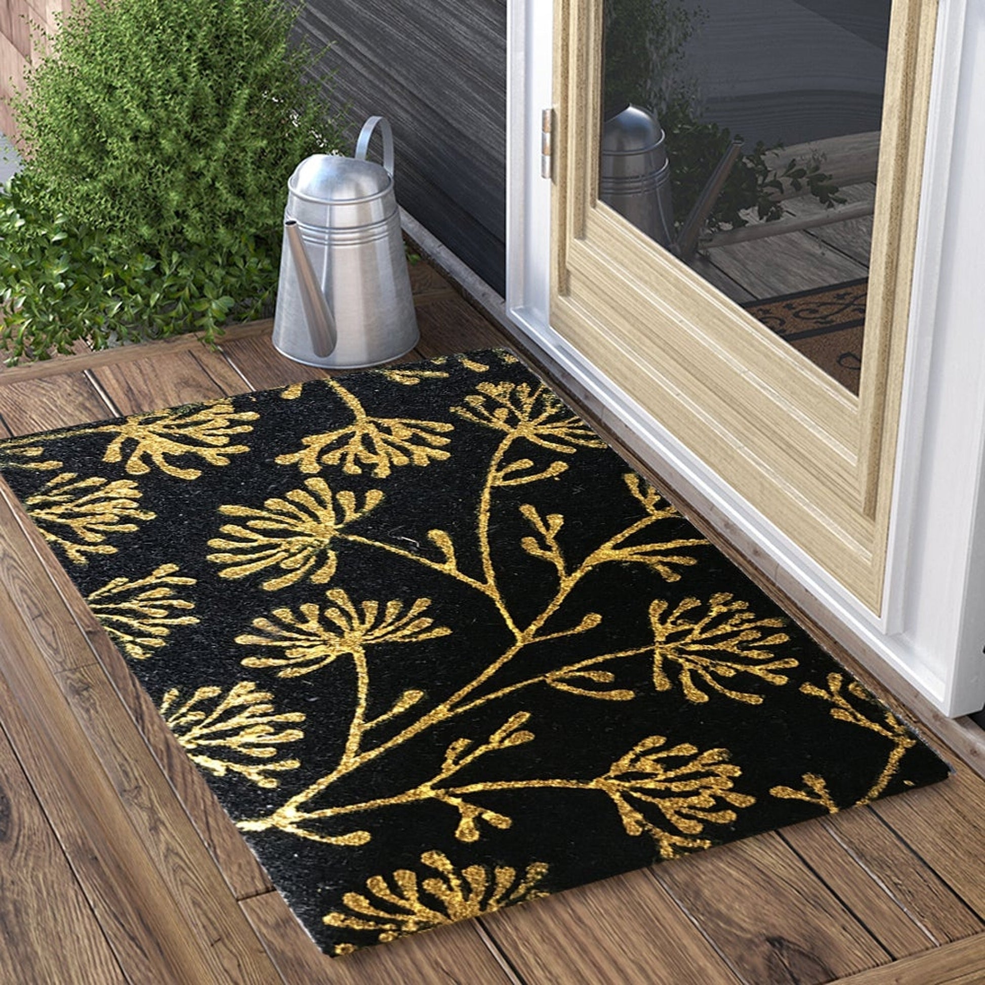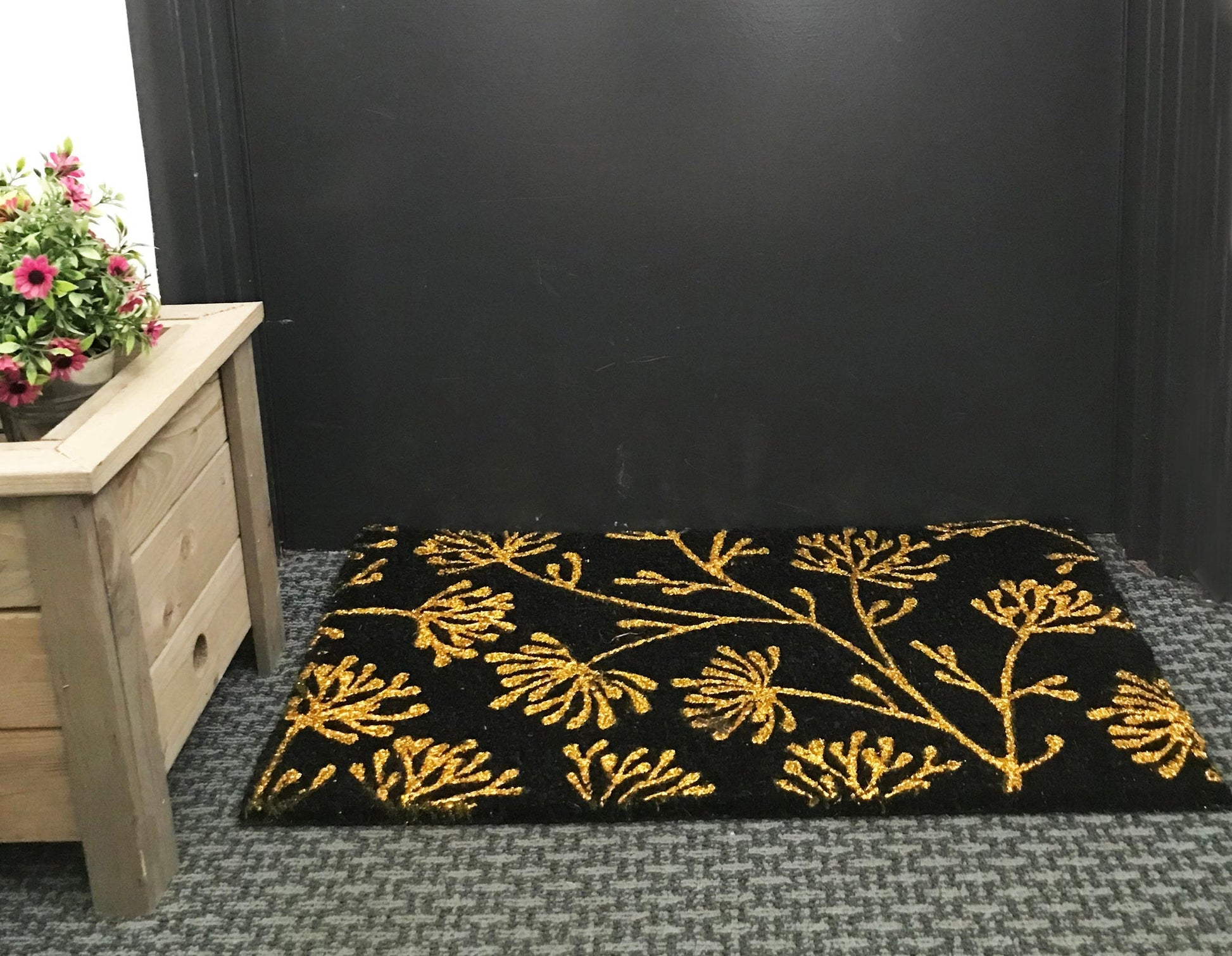 This 18x30in Floral Coir Doormat is an ideal entry rug for both indoors and outdoors. It's handmade with eco-friendly materials, while the glitter detailing adds a touch of elegance. Ideal for any entryway, this sophisticated doormat will welcome guests to your home in style.