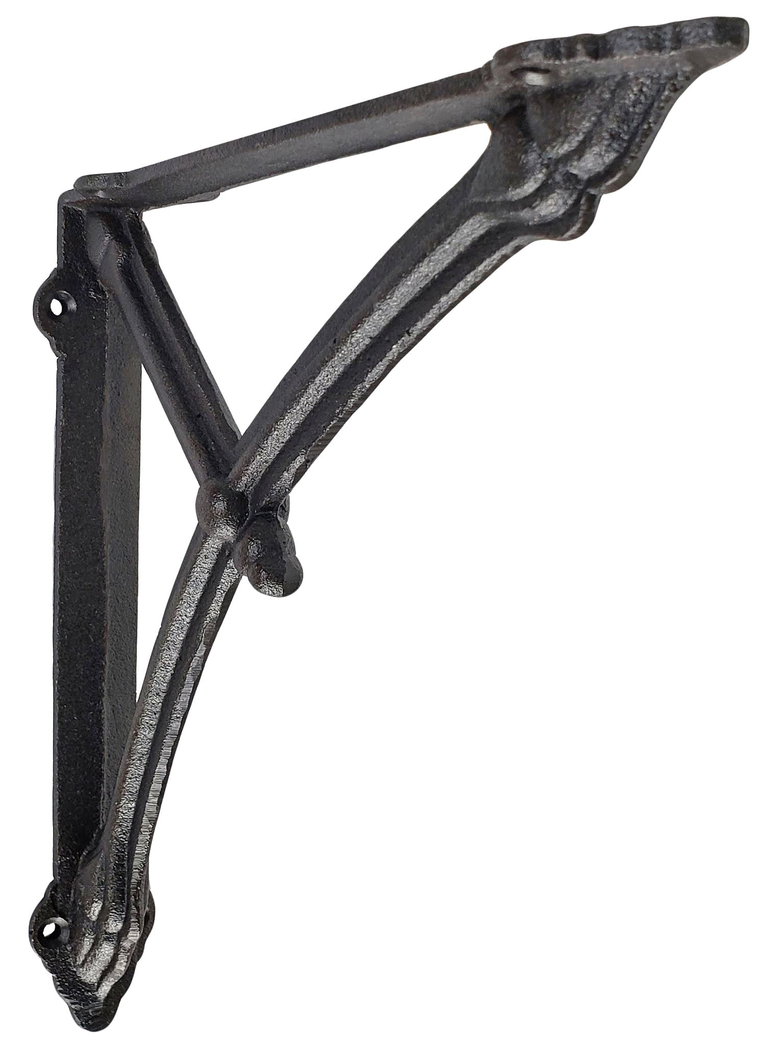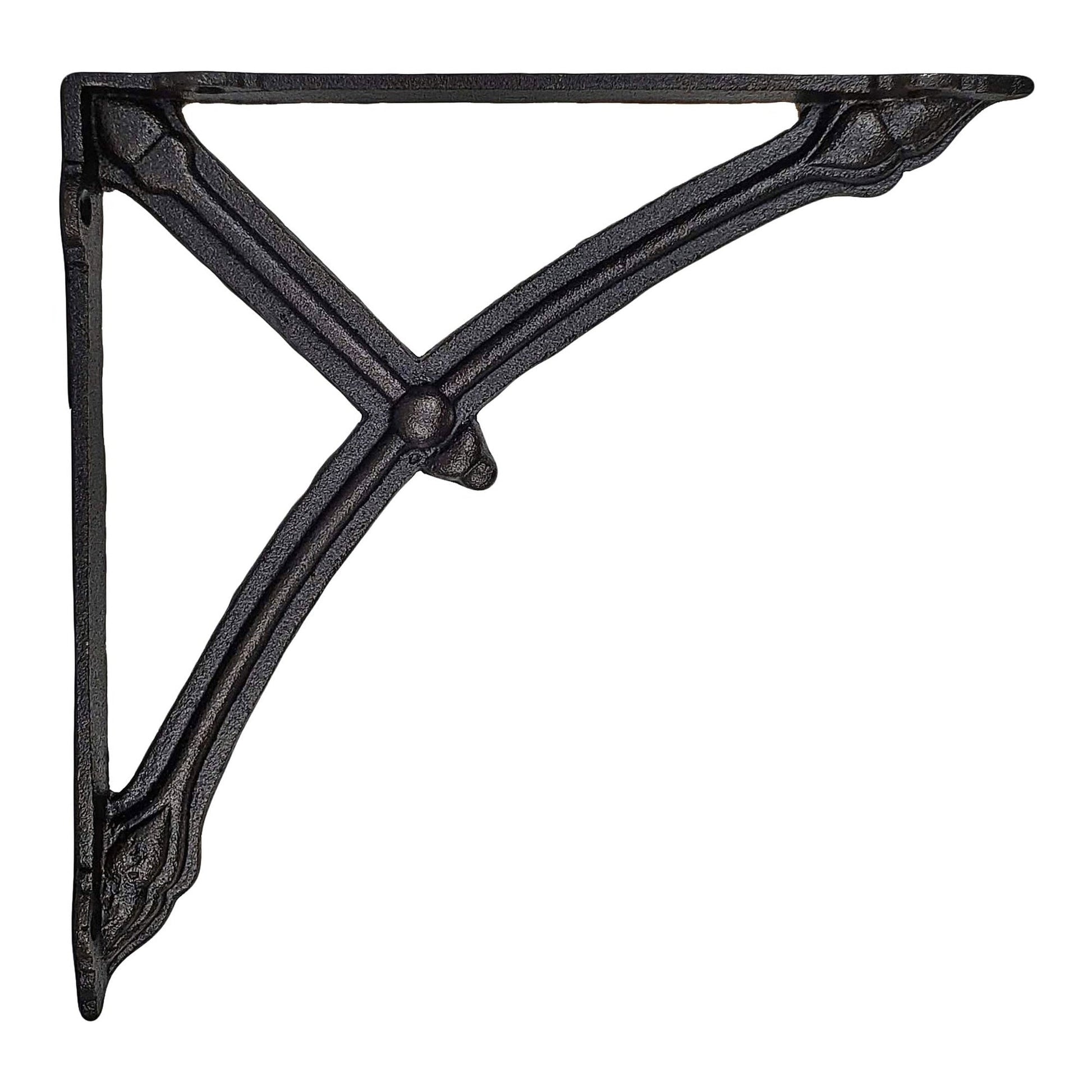 This sturdy Half Round Wall Mount Shelf Bracket with Support Arm is crafted with a rustic design in black. The bracket measures 9.8 by 1.7 by 9.5 inches and offers a center support for added stability. This heavy-duty bracket is perfect for your home storage needs.