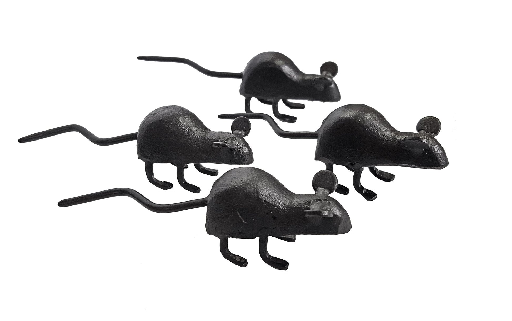 This set of charming mini mice offers a fun, unique way to bring a whimsical style to any outdoor garden or indoor area. Crafted from cast iron and hand-painted black, each one is 1.5 inches tall with a 3x1 inch base, making them lightweight enough to be placed nearly anywhere. Bring charm and character to your space with these delightful black mouse statuettes.