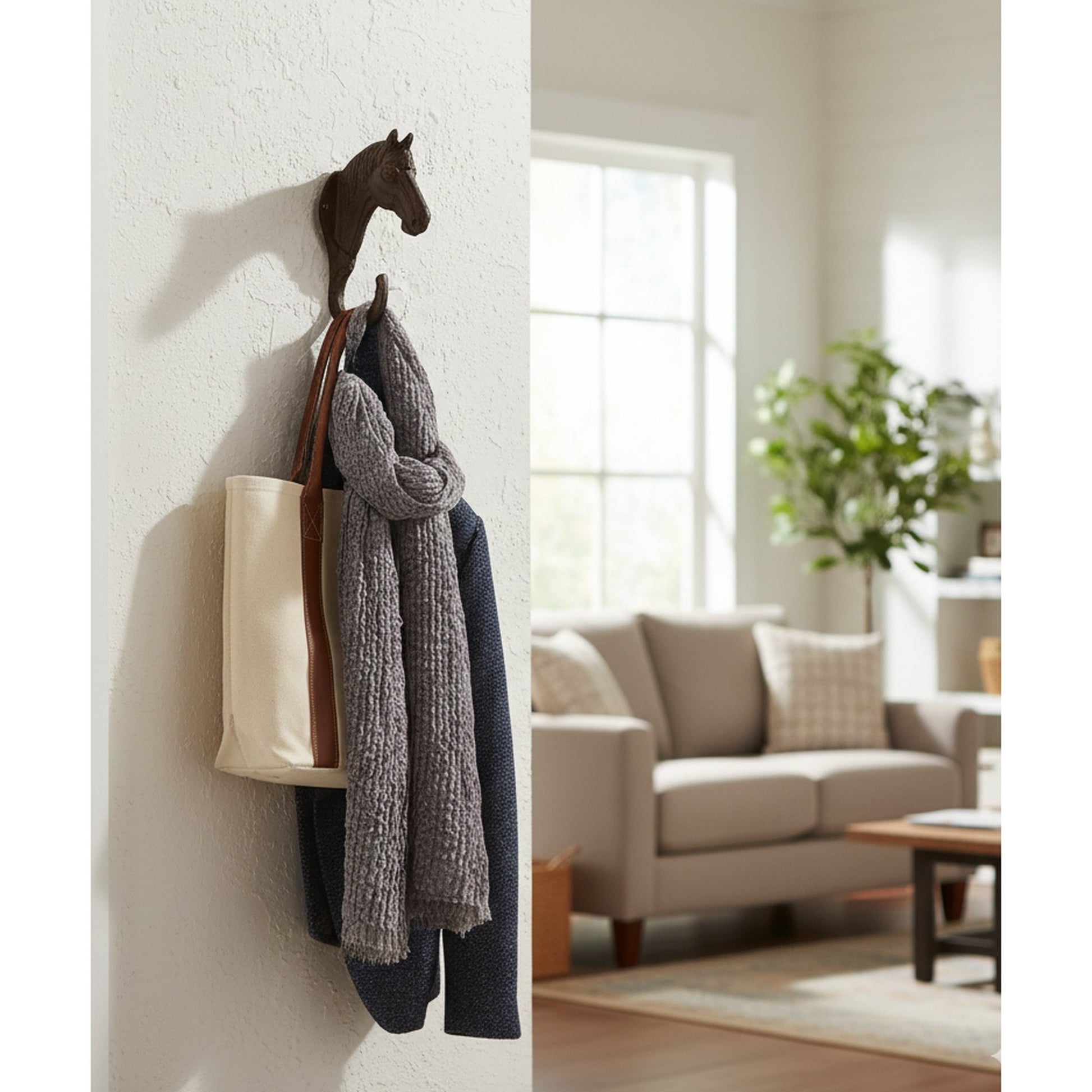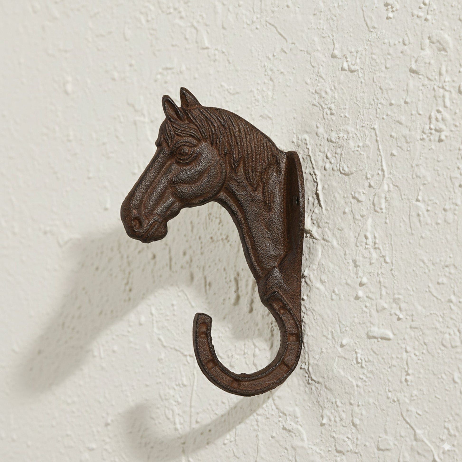 The rustic cast iron hanger with decorative horse head design is easily mounted to any wall. The hook is in the shape of a horse shoe which can be used to hang tools or other items on. Each is hand cast according to age-old tradition and craftsmanship.Hook Horse Cast Iron