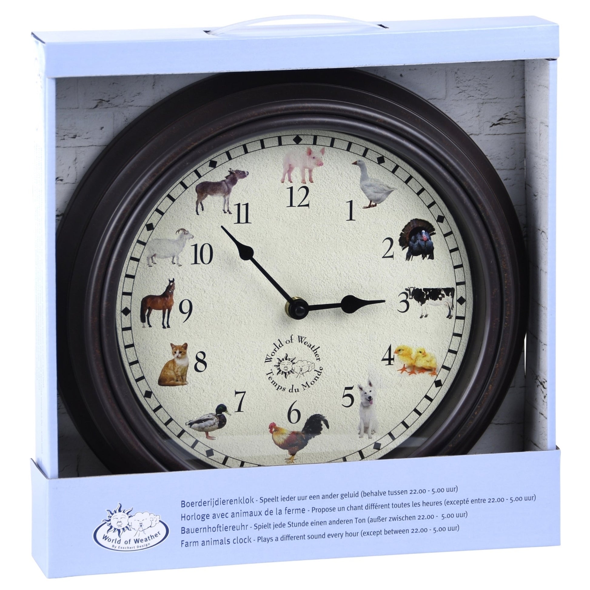 Plays a different sound every hour (except between 22.00 - 05.00)Clock farm animal sounds, PP, PVC, electronics