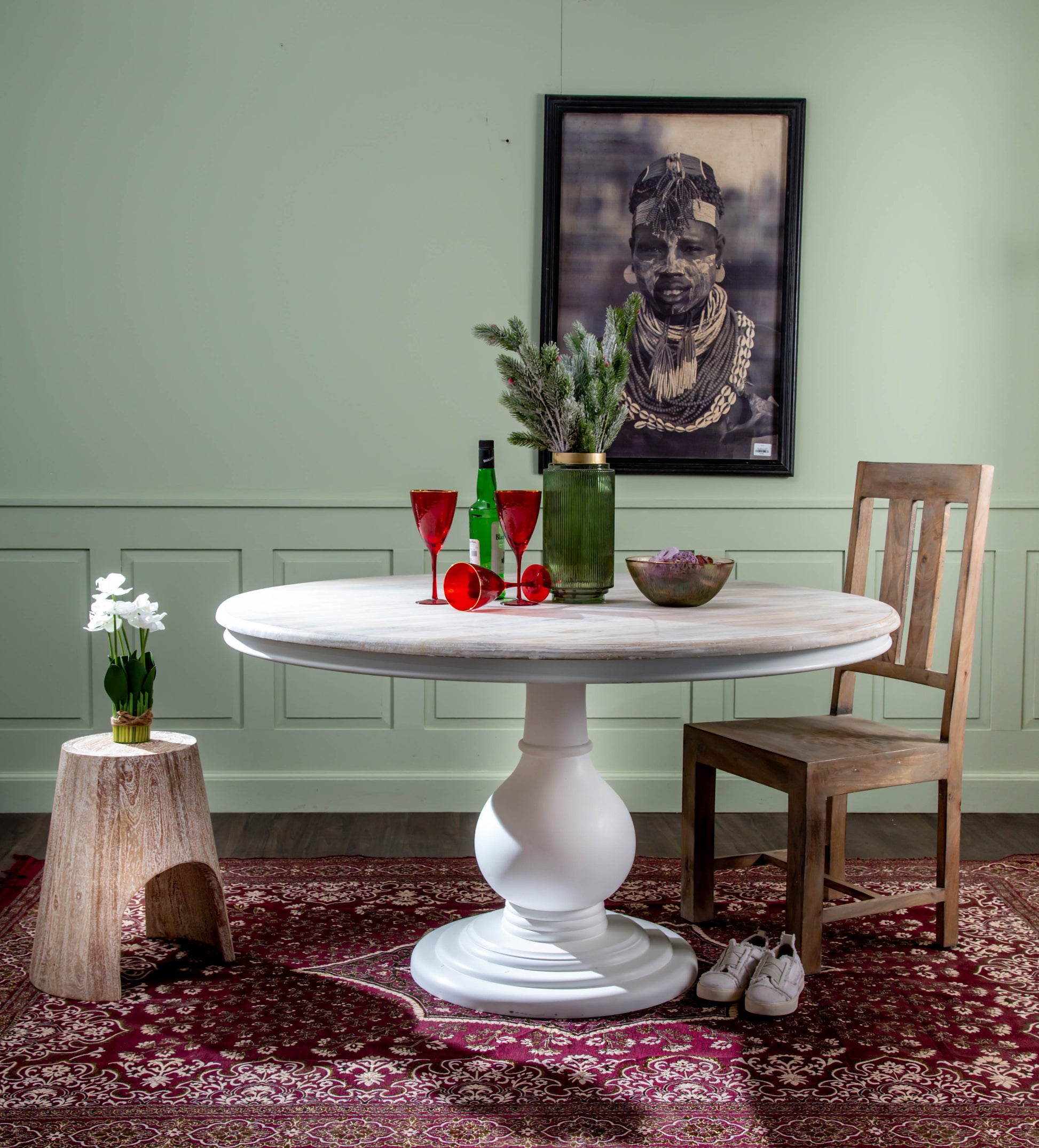 Wooden Pedestal Dining Table, Dia 48", Antique White, India