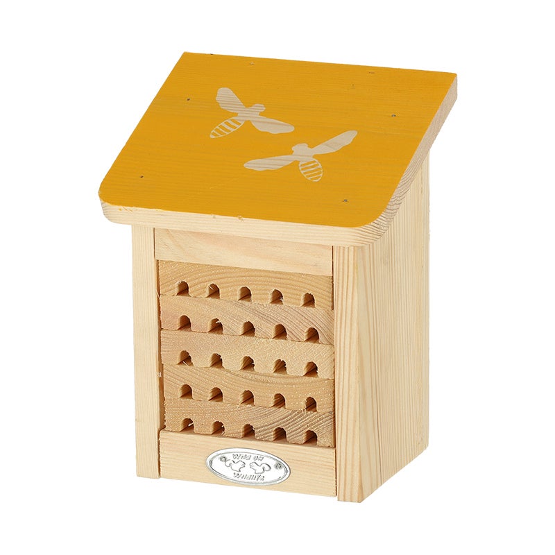 Besides the honey bee, Europe has hundreds of other bee species. These bees are very important in the pollination of flowers and plants. Whether you have wild plants, food crops, fruit trees or ornamental plants in the garden, 80% of these rely on insects for their fruit and seed formation. Many species are endangered due to the decline in flora and nesting facilities. This bee house is equipped with three wooden stacking trays which can be opened for inspection or cleaning. The hole sizes will attract solitary bees so that various types can nest here. - coloured roof with silhouette- keyhole slot- packed with a booklet- with 3 stacking trays- water based wood stain - FSC® certified wood- made in EuropeBesides the honey bee, Europe has hundreds of other bee species. These bees6x4.7x8 in