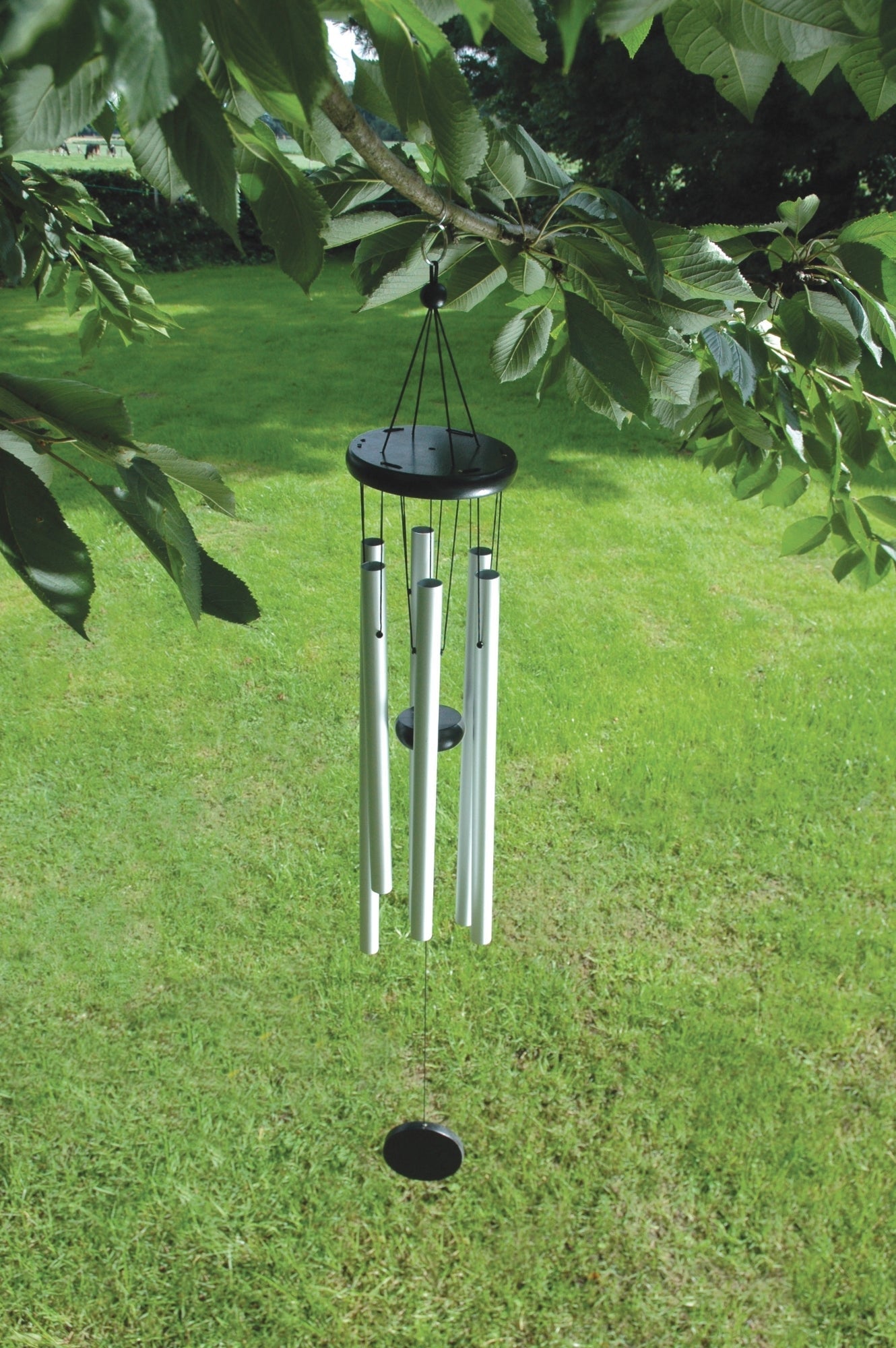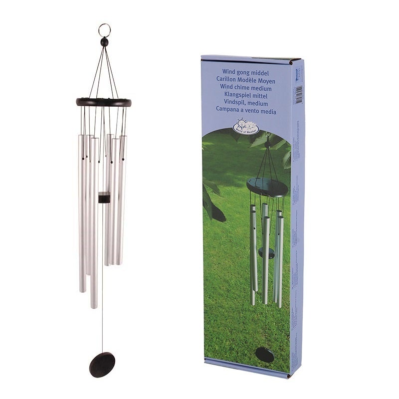 Medium sized round wind chime with 6 aluminum tubes. Packed in a gift box.Wind chime M. Aluminum, wood, twine, plastic. 12,3x12,3x77,0cm. oq/12,mc/24 Pg.97